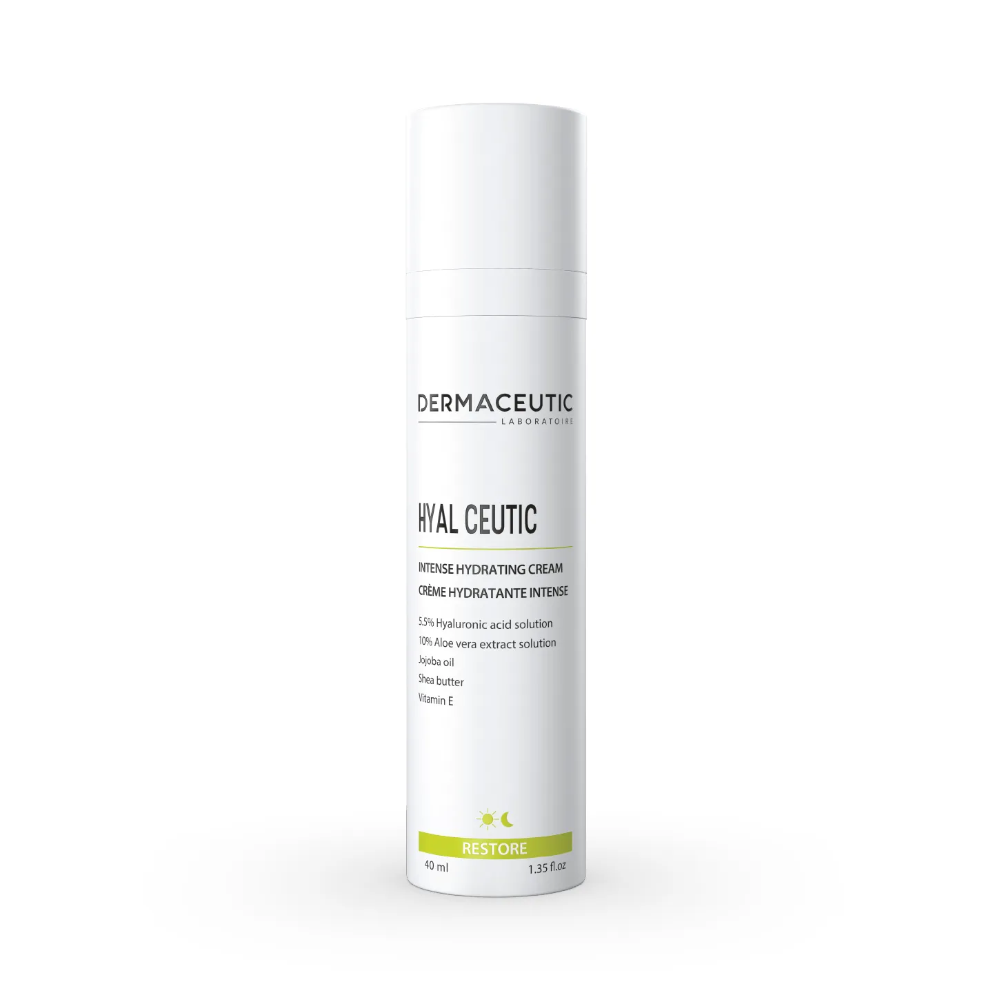 Hyal Ceutic intensively hydrates and protects the skin all day long thanks to an optimal concentration of high and low weight hyaluronic acids. A combination of powerful ingredients including aloe vera enhances its soothing and repairing action. Prevents signs of skin aging. Anti-pollution action.