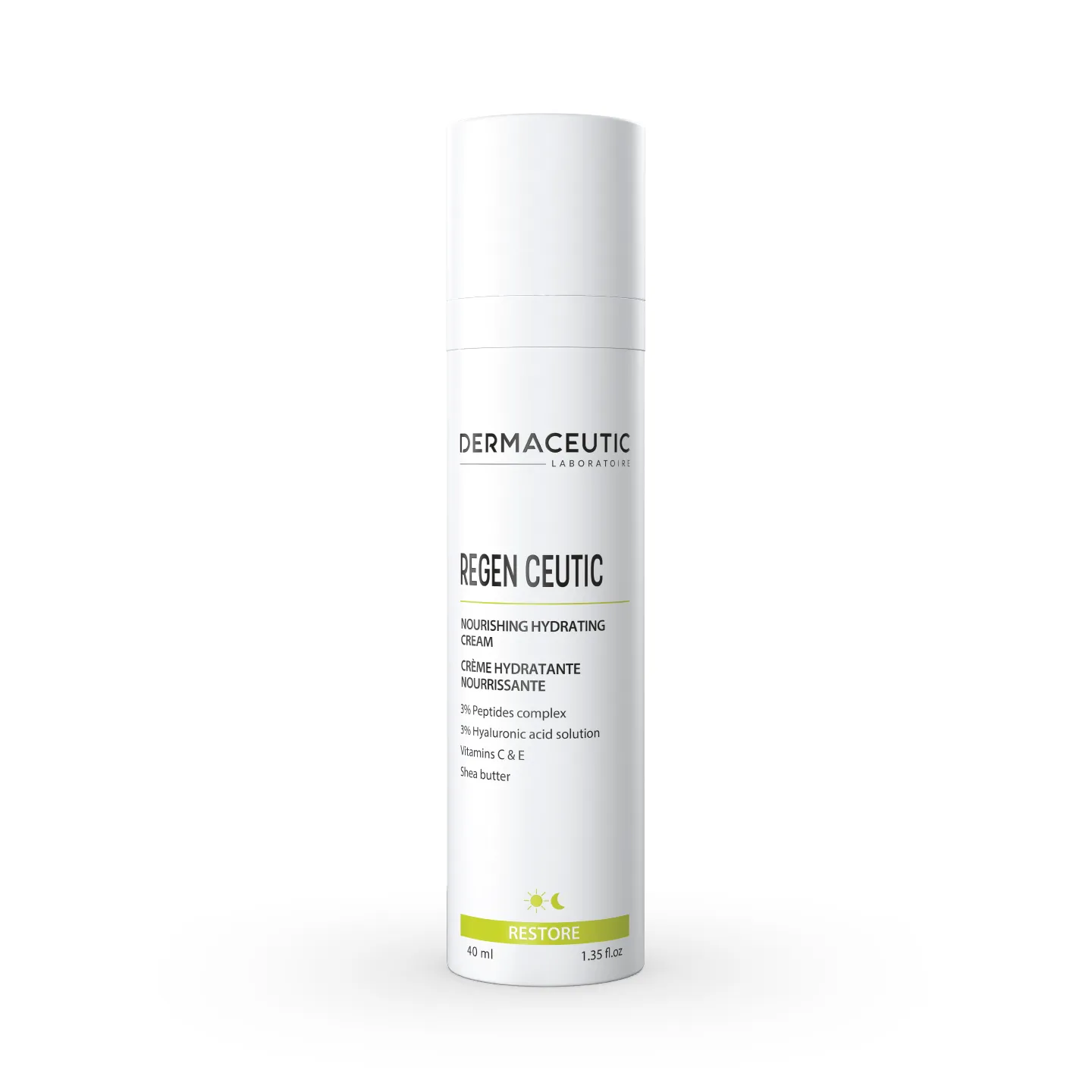 Regen Ceutic nourishes and firms the skin thanks to its peptides complex. The addition of hyaluronic acid and powerful antioxidants boosts the skin’s natural power to protect and repair itself. Prevents signs of skin aging.